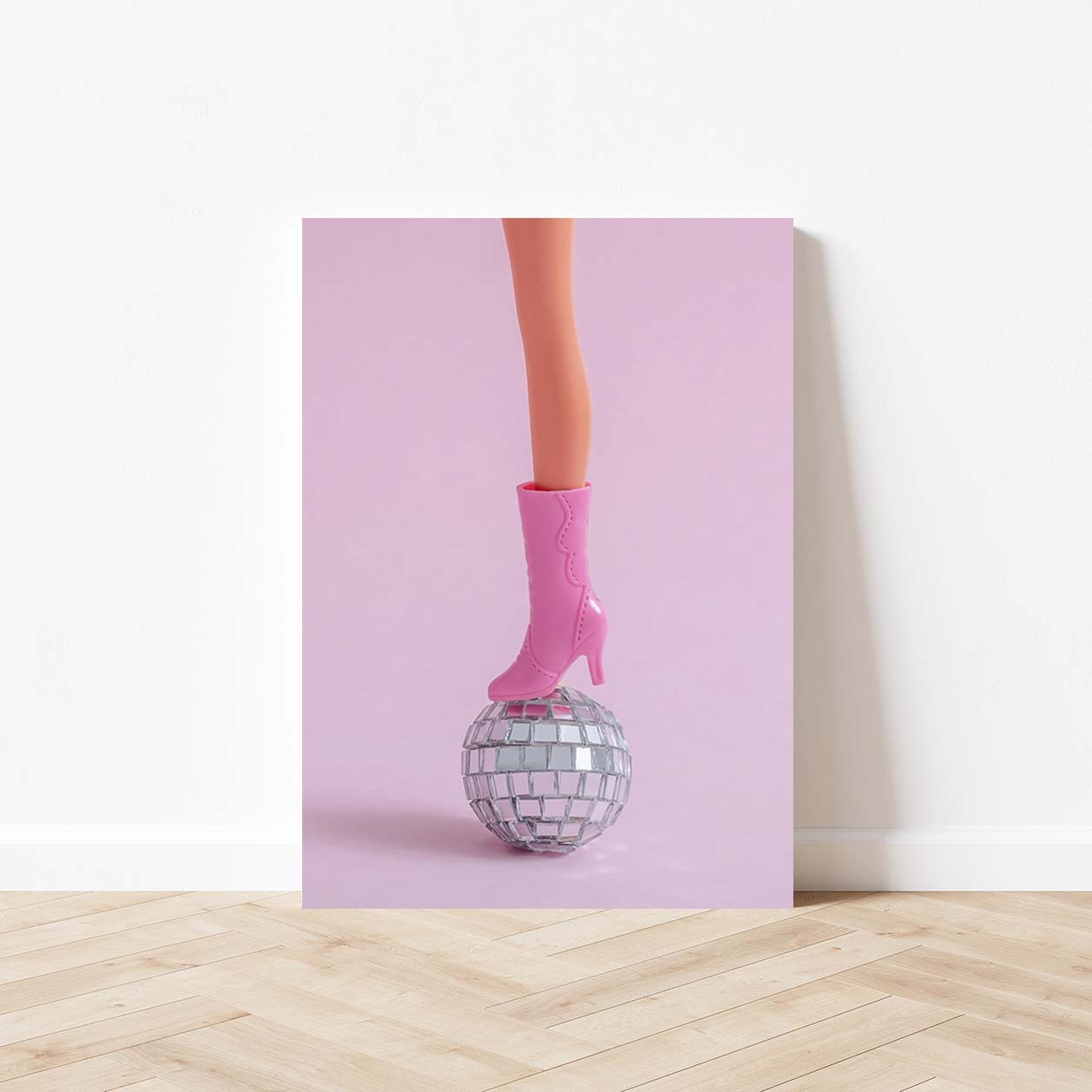 Doll feet on a small disco ball on a pink wall