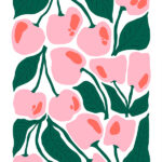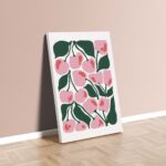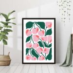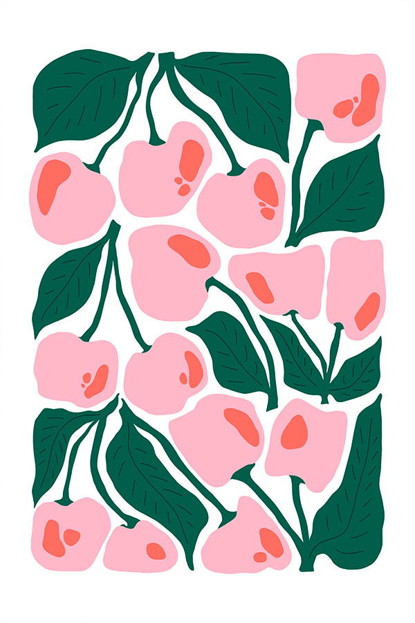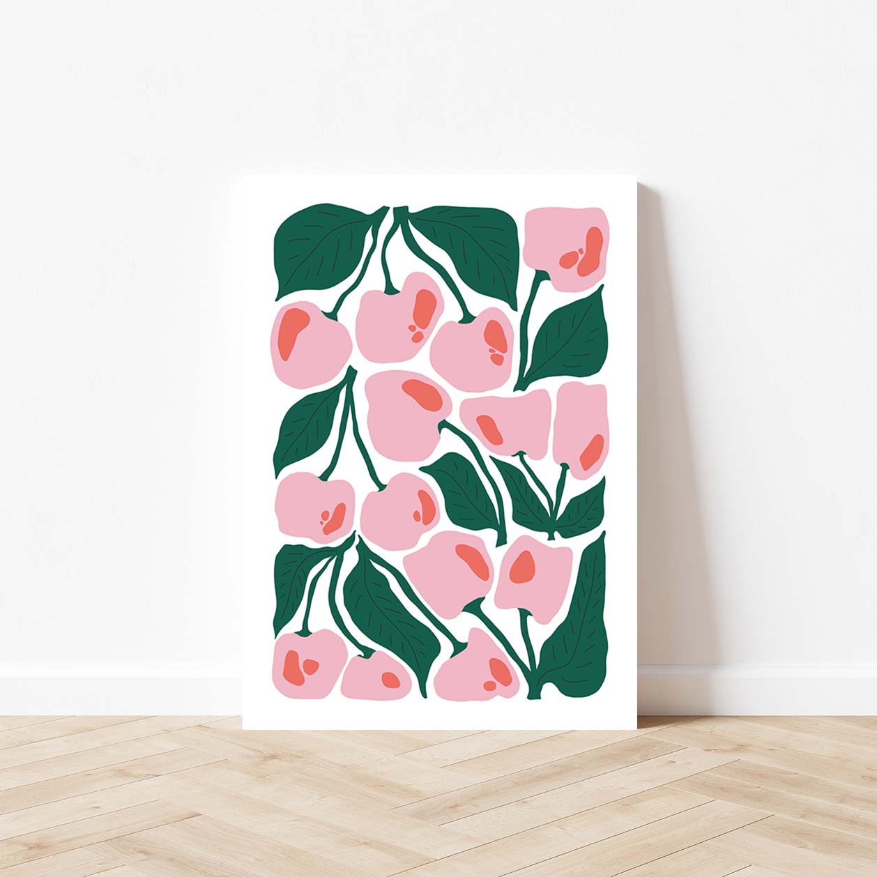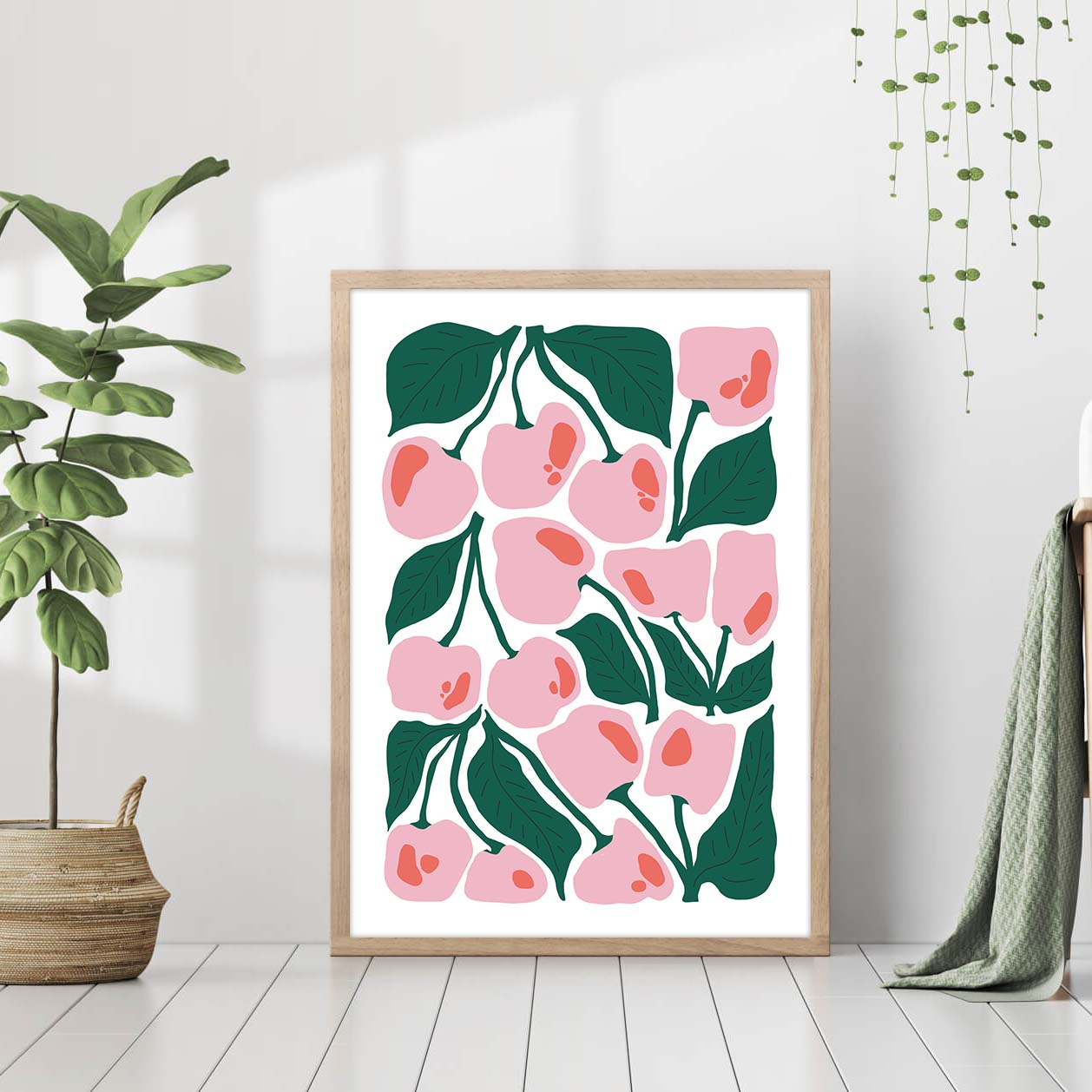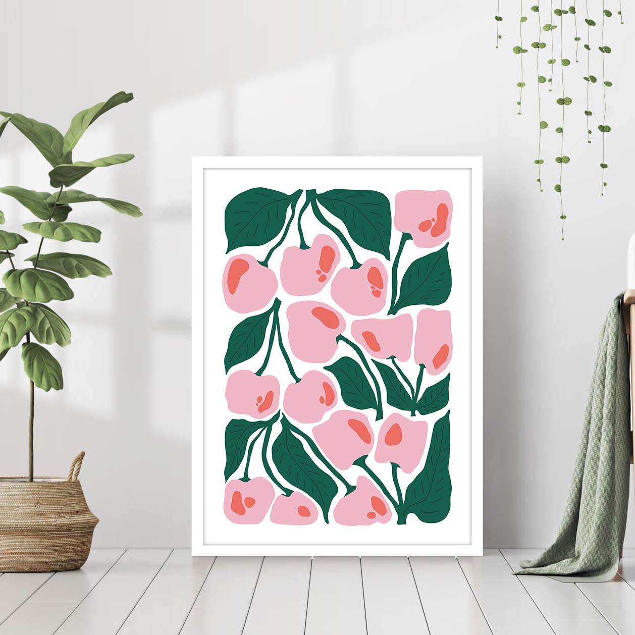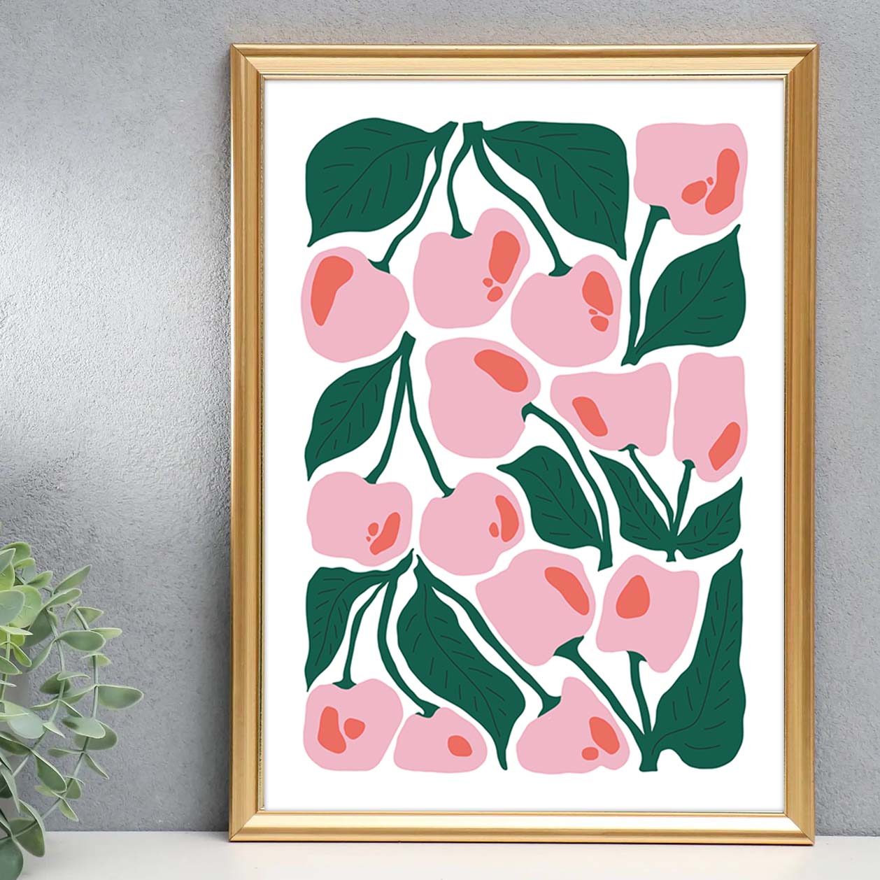 Bright Abstract Cherry Botanical Print, Abstract Cherry Wall Art, Modern Pink and Green Prints, Retro Flower Market Print, Colorful Poster