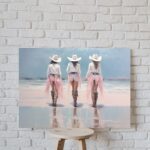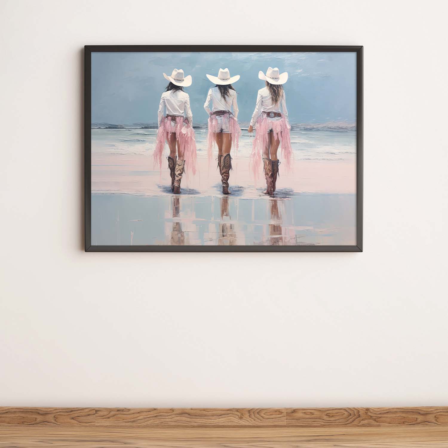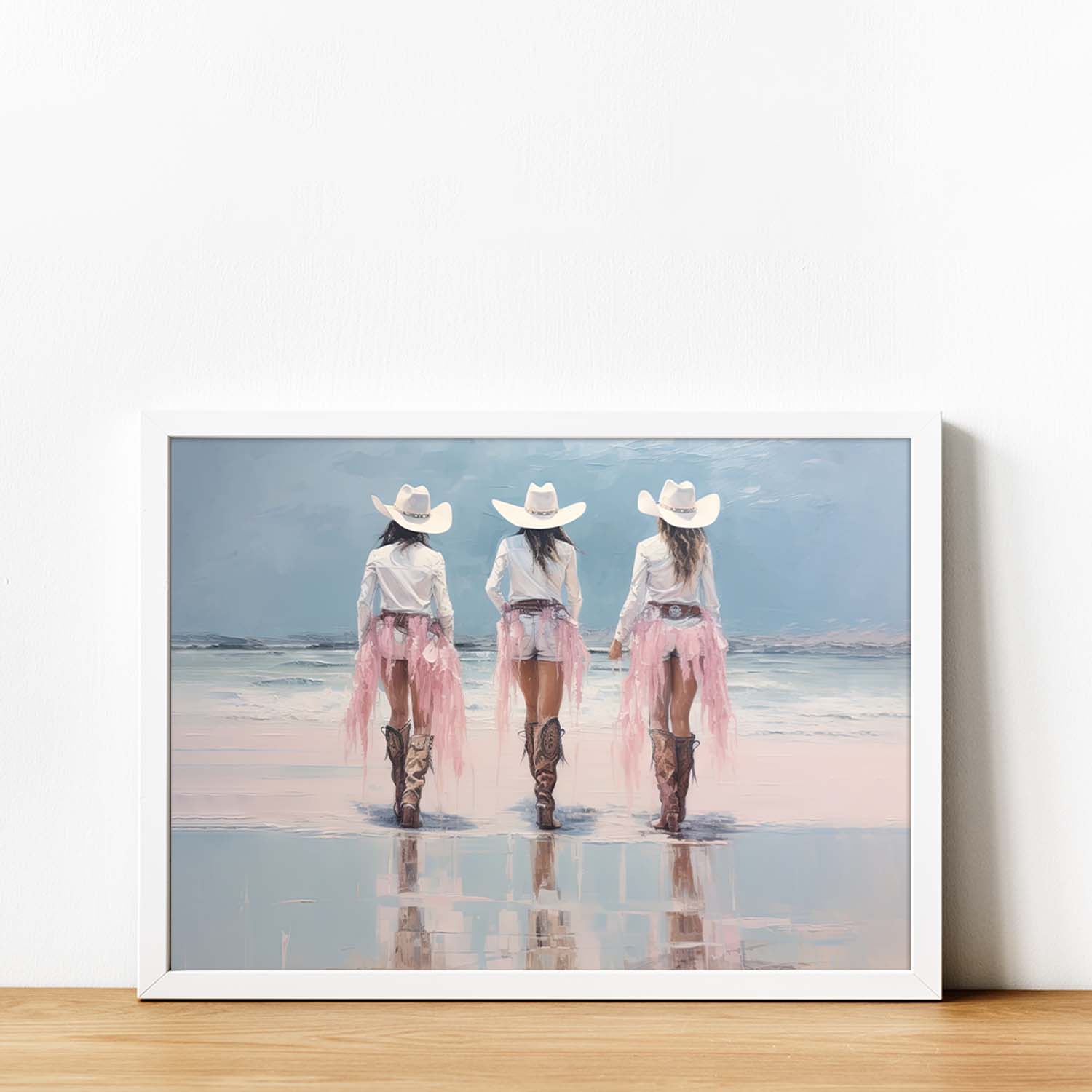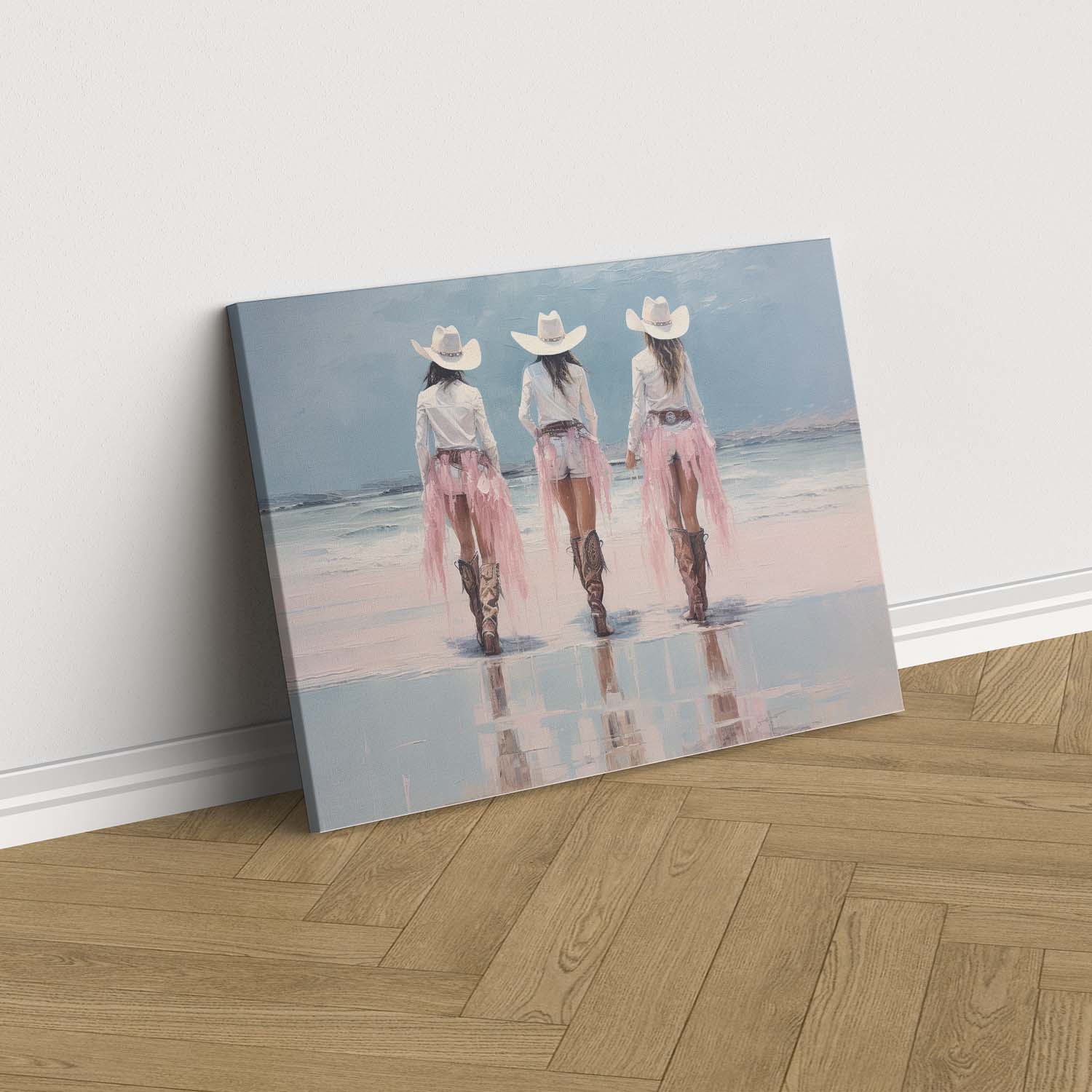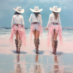 Pale pink sparkle glitter coastal cowgirls wearing long white skirts and boots