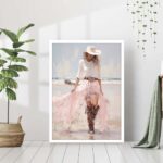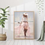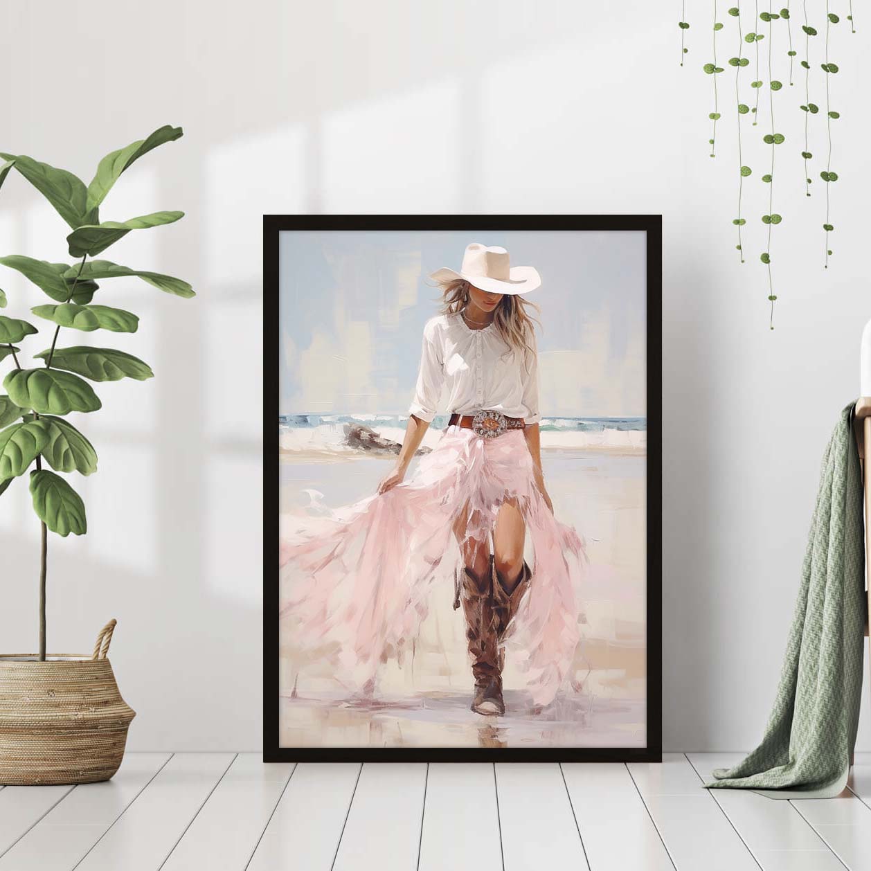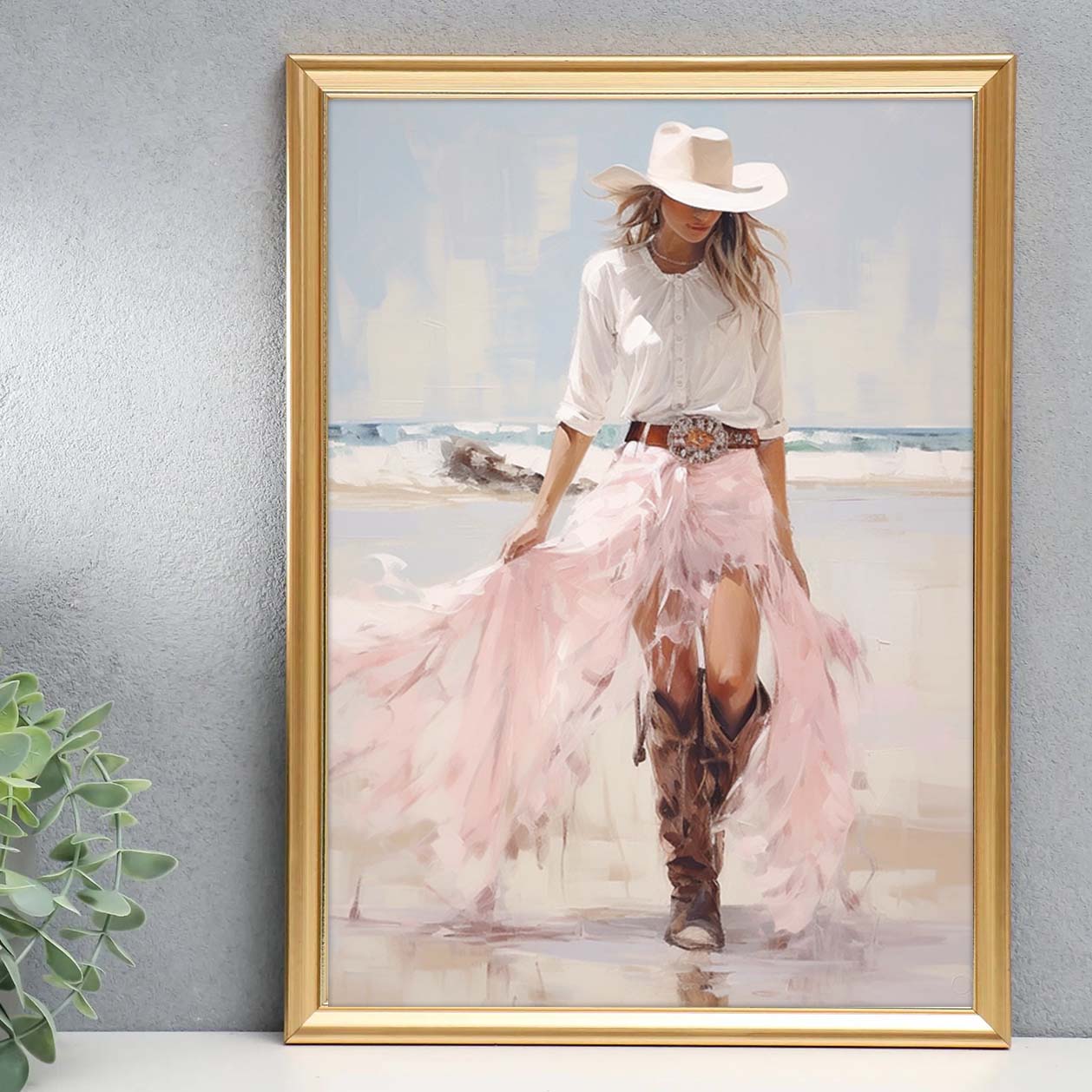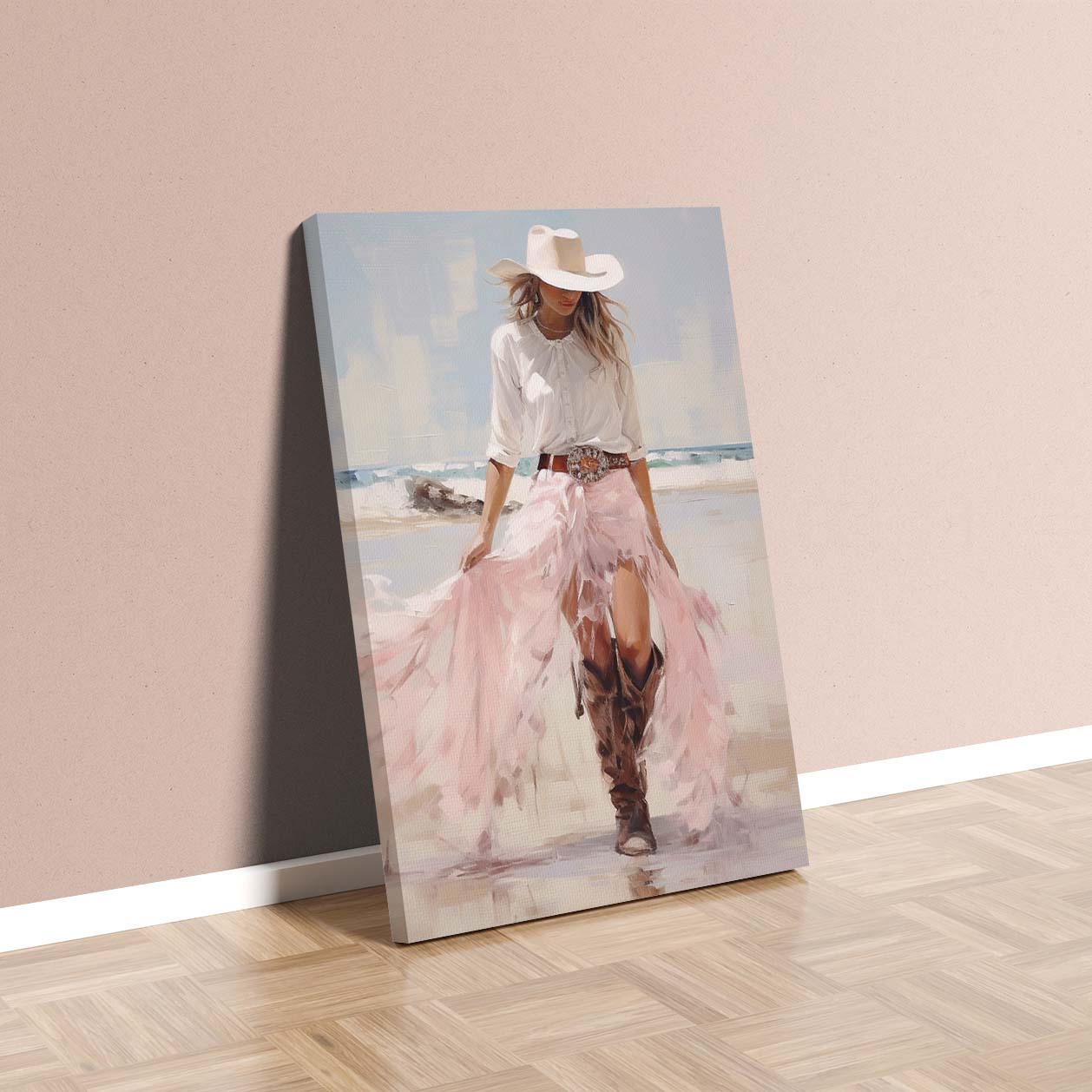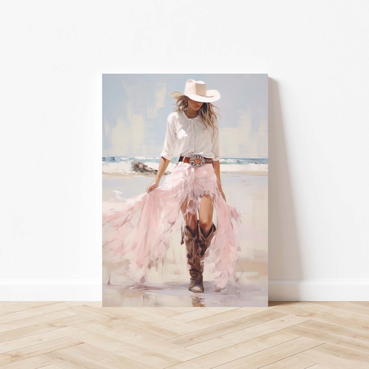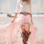 Pale pink sparkle preppy coastal cowgirl wearing boots with long white skirt on beach